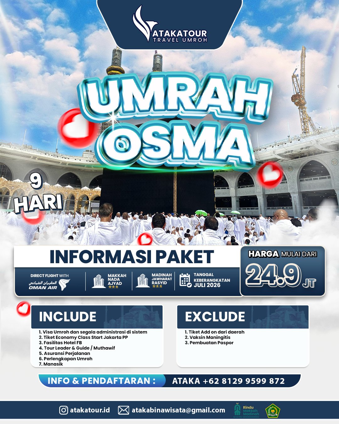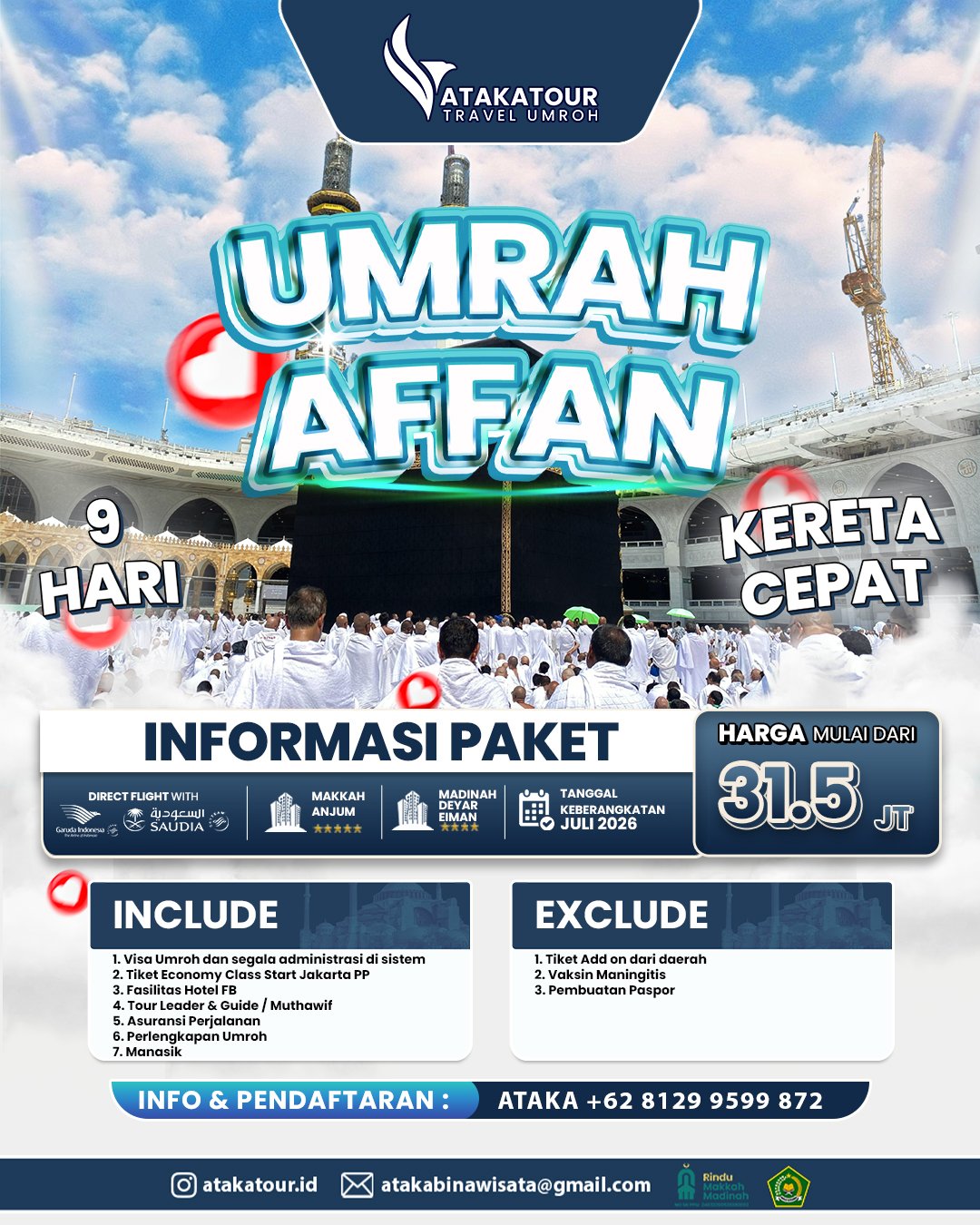 Paket Umrah Atakatour Ekonomis, dengan harga yang terjangkau bisa mendapatkan kenyamanan dalam beribadah dan pelayanan maksimal dari Atakatour.