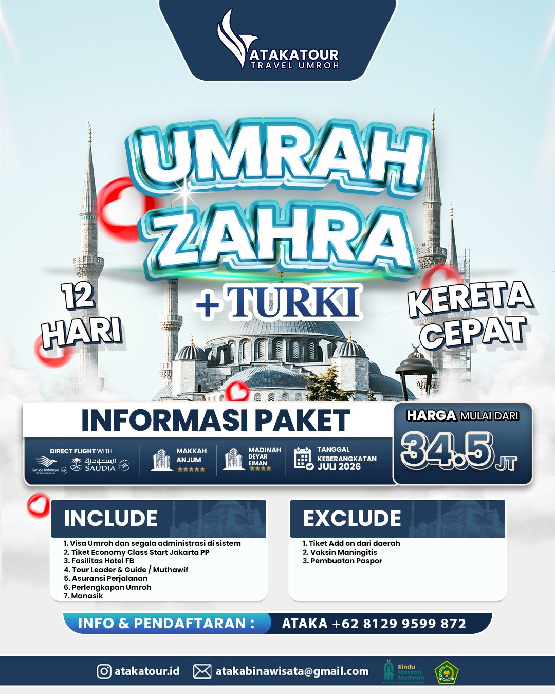 Atakatour memiliki beberapa paket Umrah yang bisa disesuaikan dengan kebutuhan calon jama’ah mulai dari 24 jutaan hingga 36 jutaan